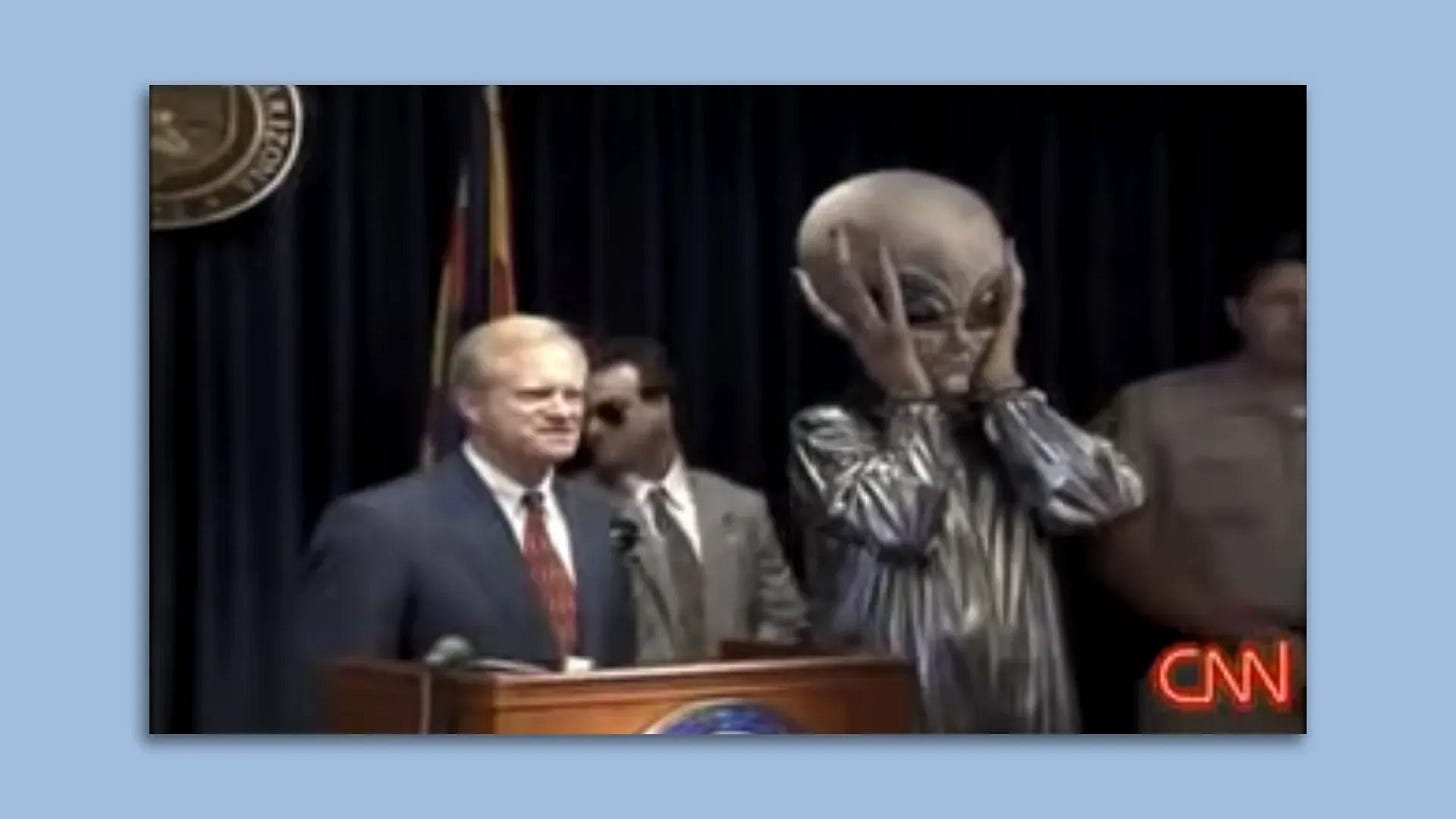 Mass sightings of UFOs didn’t stop in the Blue Book era. One of the largest mass sightings in US history occurred two decades after Close Encounters, dubbed the Phoenix Lights on the evening of March 13, 1997, which created national headlines after a group of seemingly interlocked lights flew directly over the Phoenix metro area and witnesses reported that it blocked out the stars as it flew overhead. After much public speculation, the governor of Arizona at the time, Fife Symington, held a press conference on June 19, 1997 to try to calm everyone down by having an aide come out in a rubber alien suit, ridiculing the idea that the lights represented “aliens”.